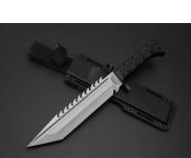 新版战狼军用刀平头 全 长:36.7CM 刃 长:24.0CM 柄 长:12.6CM 身 最大宽度:4.5CM 刀 厚:0.55CM 刃 面:喷砂 毛 重:854克(含k鞘) 钢 材:8CR18钢 硬 度:57 刀 柄:绝缘强化塑胶 刀 鞘:k鞘+彩盒