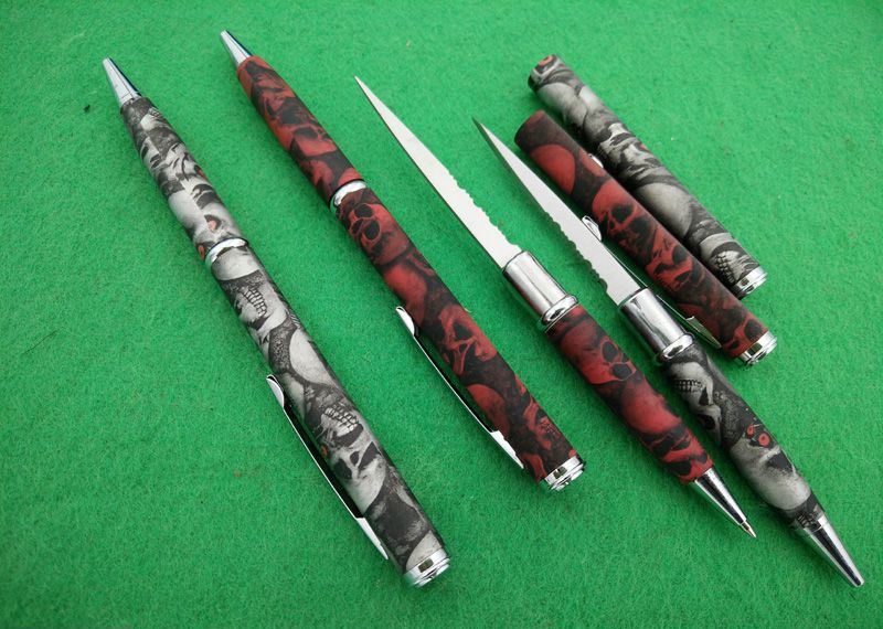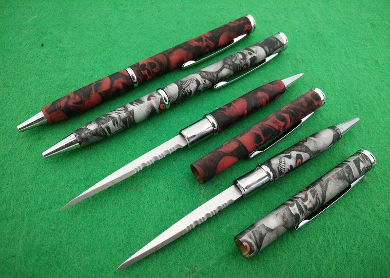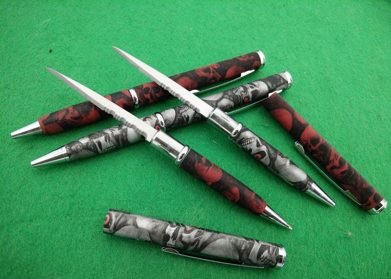 巧妙地将圆珠笔和小刀功能组合成一体,小巧便携,是理想的防卫工具,笔杆采用薄铜管,披覆骷髅头碳纤迷彩,非常靓丽!