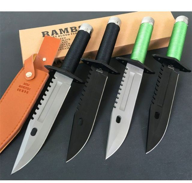 兰博D80战术直刀(四款) 全长:34cm 刃长:18.5cm 柄长:15cm 刃厚:4.5mm 刃最宽: 4cm 刃材: 3Cr13Mov 柄材: 采用无缝不锈钢管,由加强尼龙绳绕扎,求生工具包装入刀柄内,铝抛光钻石纹尾盖。 硬度: 57HRC 净重:500克(含皮套) 毛重:520克(含纸盒和皮套) 表面处理: 喷砂/发黑 仿皮刀套