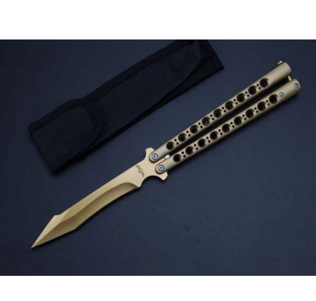 the one九孔猛禽甩刀蝴蝶刀(黄金版) 全长:29CM 刃长:13.5CM 刃厚:0.3CM 刃材料:440C 刃硬度:58 柄材料:不锈钢压铸 柄硬度:40 重量:200克 THE ONE 九孔猛禽甩刀,由The one (唯一)精工打造,是现成BM系列变异款式,刃型奇特,如同猛禽的长喙,非常凶悍!29CM超长款式, 更坚固和耐摔,转动灵活,由THE ONE 出品,不可多得的精品甩刀!