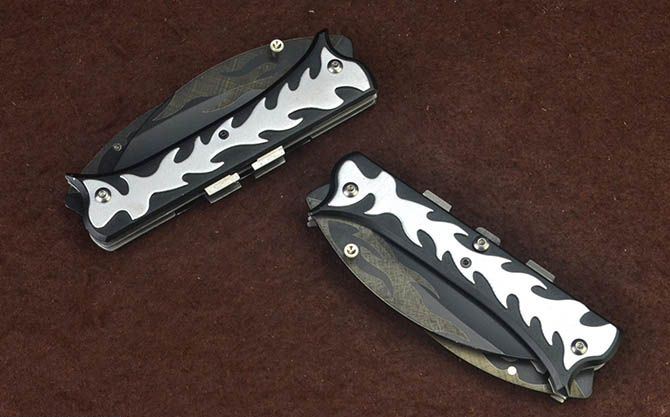合体4刃折刀 全 长:27cm 刃 长:8cm 柄 长:12cm 全闭合合体柄宽:8cm 刃 宽:2.8cm 刃 厚:2.8mm 刃 材:3Cr13Mov 重 量:350g (含包装) 硬 度:56HRC 表 面:镀钛 柄 材:铝柄 锁 闭:线锁 其 他:纸盒包装 多刃