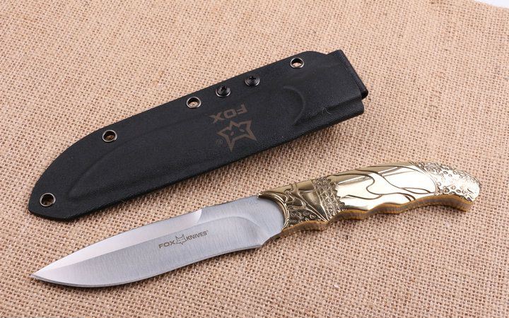 狐狸FOX之首直刀 全长:250cm 刃长:12.8cm 柄长:12.2cm 刃厚:4.9mm 刃宽:3.1cm 刃材:5CR15MOV 柄材:龙骨结构+扎图案铜柄 硬度:56HRC 净重:380克 毛重:530克(含包装物) 表面处理:砂光 刀套:K鞘和原厂彩盒