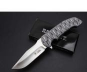 BADBLOOD-0129M高端折刀 全 长:235mm 刃 长:98mm 柄 长:132mm 刃 宽:33mm(最宽处) 刃 厚:4mm 刃 材: 8Cr14Mov 重 量:250g(含包装) 硬 度:58-58HRC 表 面:数控磨 沙光 柄 材:钢+G10 其 他:滚珠轴承系统 锋利可削纸 包 装:彩盒