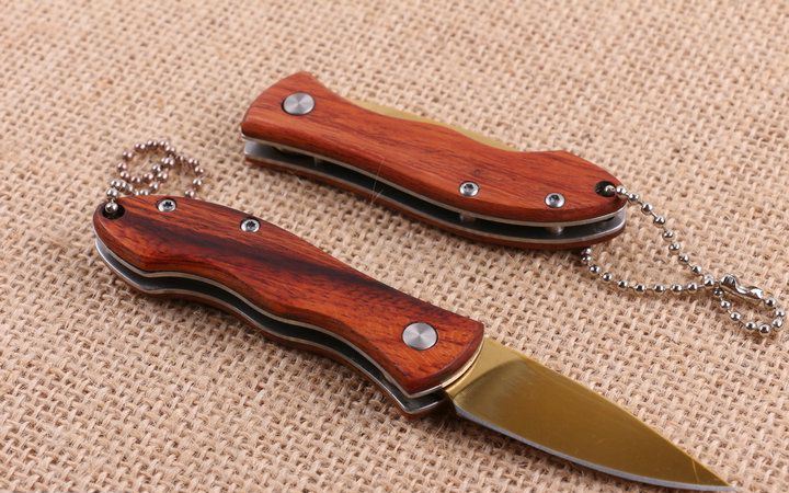 小金枝叶折刀 全长:12.6cm 刃长:5.5cm 柄长:7.6cm 刃厚:0.26cm 刃宽:1.6cm 刃材:5CR15MOV 柄材:花梨木 硬度:57HRC 净重;45克(含包装) 锁定:无锁 表面处:钛金