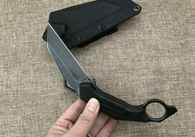 挺进者Strider乌鸦搏击爪刀 全 长:21cm 刃 长:10cm 柄 长:10.7cm 刃 宽:4.4cm 刃 厚:0.46cm 刃 材:7Cr17Mov 重 量:190g(单刀) 硬 度:58-59HRC(真空油冷热处理) 表 面:沧桑石洗 柄 材:黑色G10