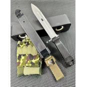 高仿八七式军刺(87军刺) 全长:30.2cm 刃长:17.8cm 刃厚:0.4cm 刃宽:3.5cm 刃材:7Cr17Mo军用不锈钢 (这个不是一般的钢是军用钢) 材质 高铬合金不锈钢 87式多用途刺刀具有剪、锯、锉、砍等多种功能,装在枪上可进行拼刺。由于刺刀在使用时,要求耐磨、强度好、潮湿气候不生锈等,热处理硬度为HRC53~57,可用于87枪