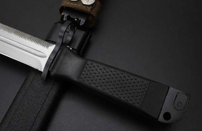 材质 高铬合金不锈钢 87式多用途刺刀具有剪、锯、锉、砍等多种功能,装在枪上可进行拼刺。由于刺刀在使用时,要求耐磨、强度好、潮湿气候不生锈等,热处理硬度为HRC53~57,可用于87枪