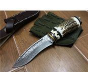大马士革分解者收藏刀(鹿角版) 全长:24cm 刀刃长度:12cm 厚度:4.2mm 硬度:59-60HRC 手柄用料:黄铜护手+天然鹿角+白钢 配真牛皮刀套 礼盒包装 才用无芯进口大马士革钢刀刃、花纹饱满清晰可见、刀刃锋利可刮汗毛