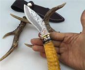 刀刃为锻打大马士革钢、刃背手工打刻鱼骨齿、手柄尾部采用天然黄羊角+骷髅头吊坠