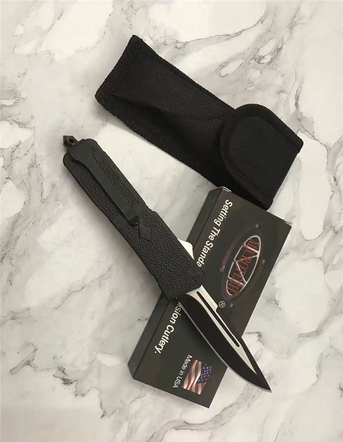 微技术伤齿龙小号A8直跳刀 全 长: 21.5cm (含尾锥长度) 刃 长: 8.5cm 刃 宽: 2cm 刃 厚: 3mm 刃 材: 440 硬 度: 58HRC 刀净重:195克 总重量: 215克(含包装物) 表 面: 黑色 柄 材: 锌铝合金 刀 鞘: 尼龙 锁 闭: 弹簧直出 刀柄表面采用了防滑处理,手感不错,刀柄采用锌合金铸造处理,硬度较高,稳定性较好。 配彩盒包装,高档尼龙刀套。