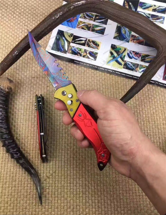 蜘蛛火焰弹簧快开折刀 全 长:215mm 刃 长:90mm 柄 长:120mm 刃 宽:25mm 刃 厚:2mm 刃 材:5Cr15Mov 重 量:140g(含包装) 硬 度:57HRC 柄 材:全钢 锁 型:快开 其 他:配彩盒