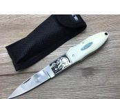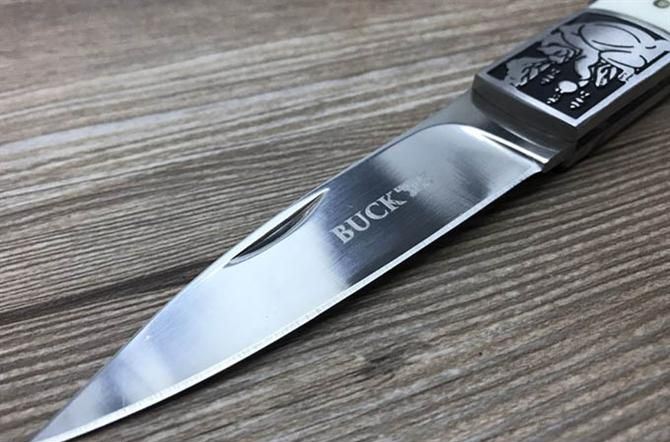巴克小肥熊折刀 全 长: 20.5cm 刃 长: 8.6cm 刃 宽: 2.0cm(最宽处) 闭 合: 11.5cm 硬 度: 57HRC 刃 厚: 0.29cm 重 量: 150克 表 面: 镜光 刃 材: 440C 柄 材: 全钢头雕花+聚脂柄 锁 闭: 传统式制尾锁 其 他: 尼龙套包装,刃口锋利