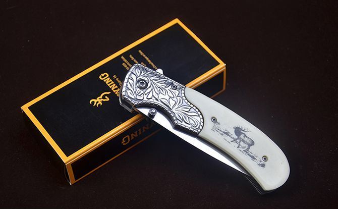 勃朗宁B062浮雕影木快开折刀 全 长:20.8cm 刃 长:8.8cm 柄 长:11.9cm 刃 宽:2.7cm 刃 厚:2.2mm 刃 材:5Cr13 重 量:200g(含包装) 硬 度:58HRC 表 面:雕刻纹彩钛和金色 柄 材:浮雕钢柄图案凸起+影木/牛骨 锁 型:快开 其 他:配彩盒