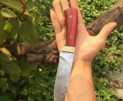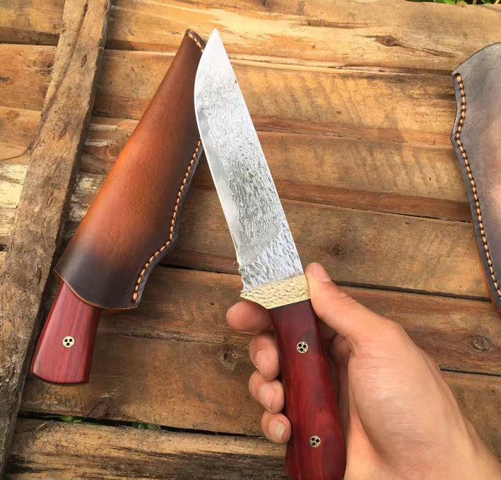 火凤凰大马士革直刀 全长:25cm 刃长:14cm 手柄长:11cm 刀刃钢材:进口大马士革钢VG10(高硬度)一体钢(深度冷热处理) 钢材厚度:3.2mm 硬度:60+HRC 手柄材料:纯黄铜护手锻打凹凸粒保留+鲜红柯檀木 包装配置:高档礼品盒+手工意大利牛皮刀套