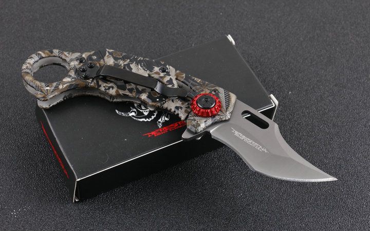 披覆X62爪刀 全长:18.2cm 刃长:6.5cm 柄长:11.7cm 刃厚:0.29cm 刃宽:2.7cm 刃材:5CR15MOV 柄材:全钢片 硬度:57HRC 净重:148克(含包装) 锁定:线锁 表面处:披覆 其他:原厂彩盒