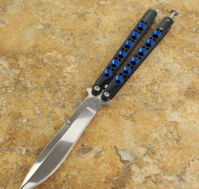 The oneBM42蓝翠眼镜面刃蝴蝶甩刀,蝴蝶经典款式之一,一体柄型,刀刃选用高级440C钢,数控精磨刃,镜面抛光处理,螺丝扣锁都经过严格调配,刃口锋利,Theone特制款式,秉承Theone优良血统