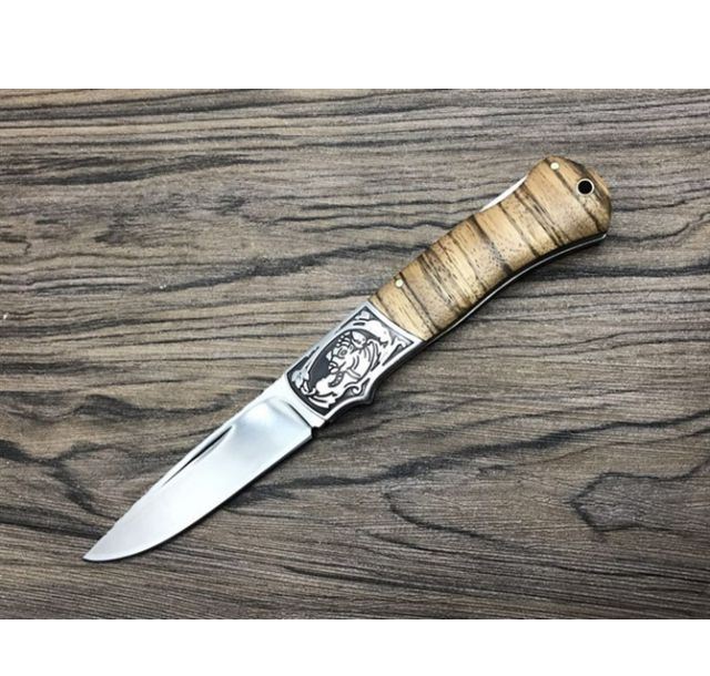 BUCK巴克老羊折刀 全长:23cm 刃长:10cm 刃宽:2.2cm(最宽处) 刀柄:13cm 硬度:57HRC 刃厚:0.29cm 重量:250克 表面:镜光 刃材:440C 柄材:全钢头雕花+木 锁闭:传统式制尾锁 其他:尼龙套包装,刃口锋利。