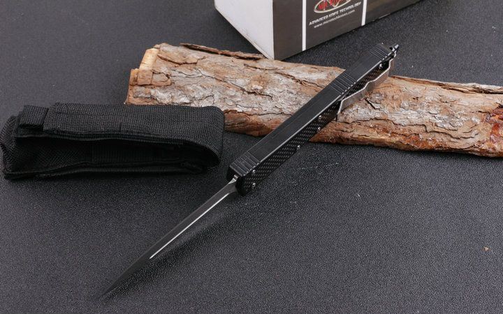 微技术圣蚂蚁碳纤维柄双锋直跳刀 全 长: 26.5cm (含尾锥长度) 刃 长: 10.8cm 刃 厚: 3mm 刃 材: D2 硬 度: 57HRC 总重量: 220.0克(含包装物) 表 面: 精细沙光(刀刃) 柄 材: 铝合金经CNC电话锣成型,极度精密,再精镶碳纤维手柄。 刀 鞘: 尼龙 锁 闭: 弹簧直出 备 注:带背夹