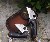 暴龙大马士革小折刀 全长:10cm 刀刃:4cm 折合长:6.5cm 刀刃材质:大马士革钢 刃厚:2mm 硬度:59HRC(冷热处理) 手柄做工材料:天然黑檀木+钢片石洗附带安全锁装置