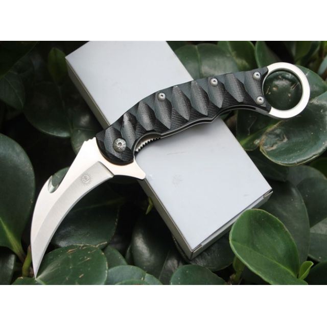 漠江极速魔爪快开折刀 全长:19cm 刃长:7cm 刃宽:2.5cm(最宽处) 刃材:9Cr18 硬度:57HRC 刃厚:0.48cm 柄长:10cm 表面:拉丝 柄材:G10 重量:110克