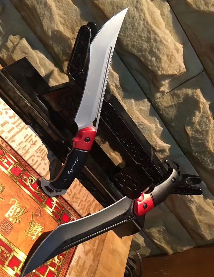 挺进者月形弯刀 全长:30cm 刃长:17.5cm 刃宽:4cm (最宽处) 刃厚:0.56cm 刃材:8Cr13 硬度:59HRC 表面:渡钛 柄材:航空铝柄 柄长:12cm 刀重:340克 总重:650克(含包装物) 其他:刀身贯穿至刀柄末端,用铜钉固定 附件:刀套