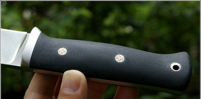 鹰版2017随行H1小直刀 全长:213mm 柄长:115mm 刃长:95mm( 有效刃长) 刃厚:5.0mm 刃宽:31mm(最宽处) 刃材:A2 重量:220g(刀净重,不含鞘) 硬度:60HRC 柄材:A级G10 刀鞘:美国进口Kydex 磨式:平磨(有较好的强度) 表面:钢本砂光 热处理:真空油淬(增加晶体颗粒细腻度,具有最好的韧性) 包装:蛇皮纹纸手工盒