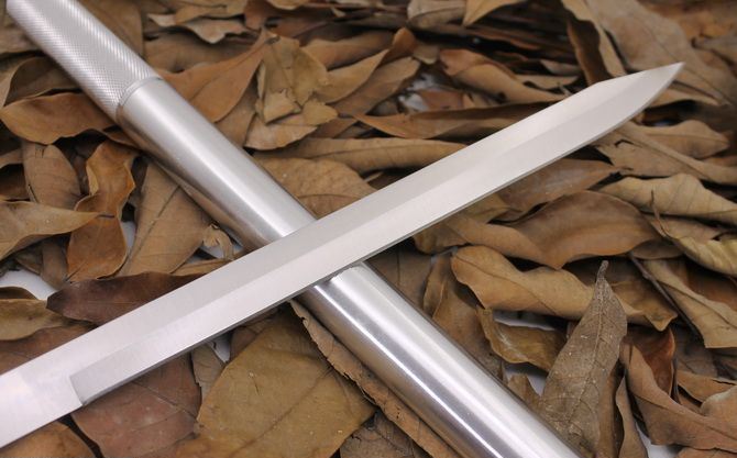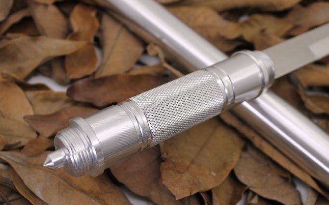 小号警棍博击刀带撞针头砂光尖头 全长:54.CM 刃长:29CM 接长:83CM 管径:2.6CM 刀厚:0.3CM 刃宽:1.9CM 重量:450g(含包装) 刃材:5Cr13Wov 砂光 管材:铝管 柄材:合金铝 硬度:56HRC 配件:高档耐磨加厚尼龙套(绿色迷彩)