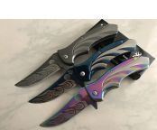 勃朗宁鬼骨火折刀 全 长:21.5cm 刃 长:8.5cm 柄 长:13cm 刃 宽:2.7cm 刃 厚:2.5cm 刃 材:440 重 量:165g(含包装) 硬 度:58HRC 表 面:镀彩 柄 材:全钢扎花 锁 型:侧锁 其 他:彩盒
