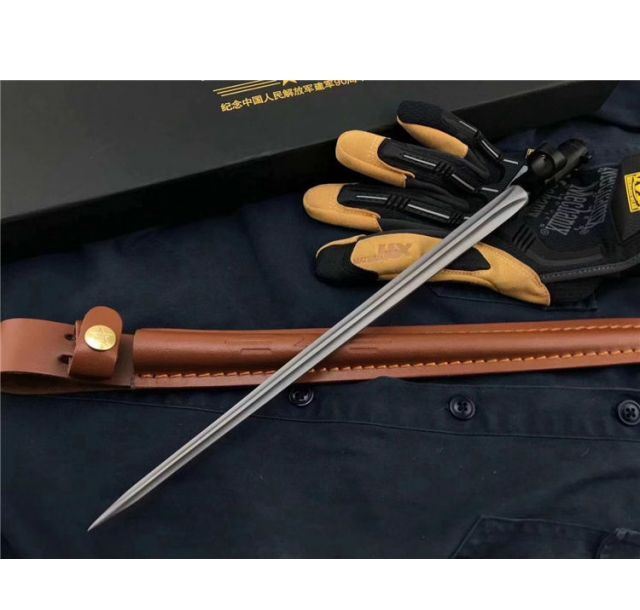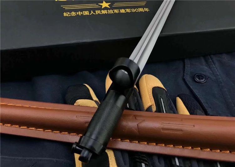 90周年尖头56式三棱刺刀 全长:38cm 刃长:32cm 刃厚:1.8cm 刃宽:1.8cm 刃厚:1.8cm 刃宽:1.8cm材质 合金钢刀鞘:真皮