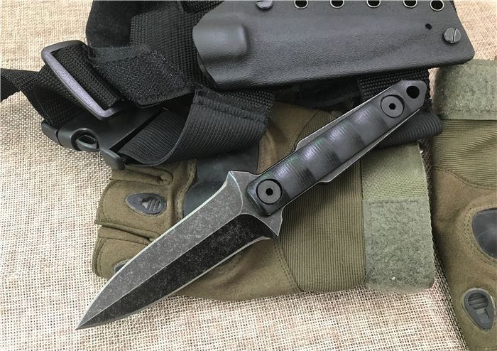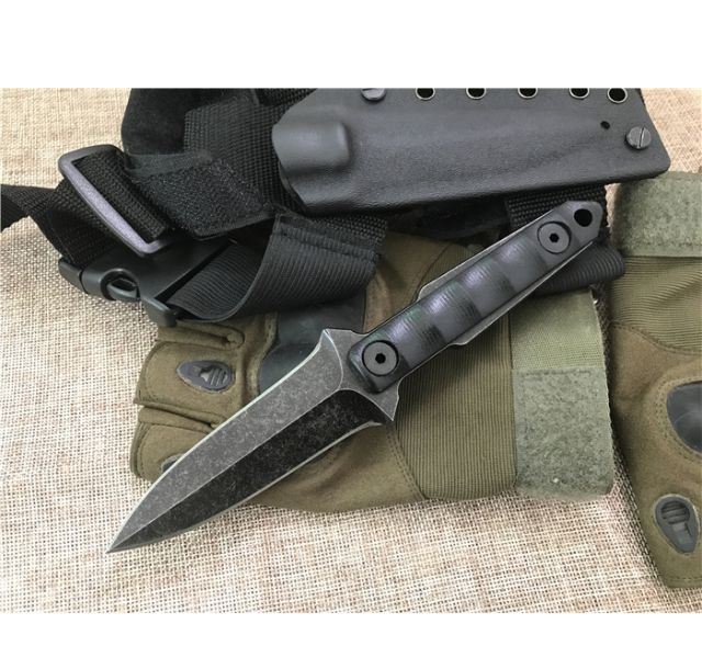 特种兵格斗双刃刀(进口D2钢) 全长:200MM 刃长:95MM 刃宽:13MM 刃厚:4.1MM 刃面打磨:数控V磨 刃面处理:沧桑石洗 热 处 理:真空油淬热处理 硬度:60-61HRC 材料: D2(100%可测试) 柄材:黑色G10 刀鞘:进口K鞘 刀重:约155G 刀鞘重:约116G