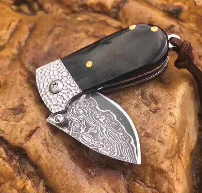 小黑猪大马士革折刀 全长:9.3cm 刃长:3.5cm 柄长:5.8cm 刃厚:2.5mm 刃宽:2.0cm 刃材:进口大马士革钢 硬度:58-60HRC 重量:约75克(含包装) 表面:锻打吉祥如意花纹原色 柄材:黑牛角+不锈钢+黄铜 标配:高级礼品盒+标配绒布袋+可选配手工皮套