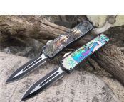 北美狼图腾直跳刀 全长:23CM 刃长:9CM 柄长:14CM 刃厚:0.3CM 硬度:56 HRC 刃材:440 表面:发黑拉丝 把手:扎花加热影印技术图案,耐刮 净重:220克整刀 毛重:330克含包装物 开合:双动作,直推开关,自动弹出和收回 包装:耐磨专用战术尼龙套 口袋刀夹:弹簧刀夹 玻璃敲击器:不锈钢玻璃敲击器