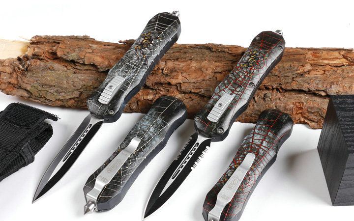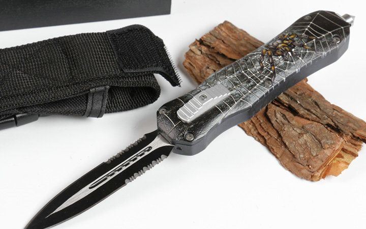 微技术白蜘蛛直出弹簧刀 全长:21.8cm含尾锥长度 刃长:8.8cm 刃厚:3mm 刃材:440 硬度:57HRC 总重量: 460.0克含包装物 表面:黑钛伴拉丝刀刃 柄材:锌铝合金 刀鞘:尼龙 锁闭:弹簧直出 备注:带背夹+木盒,双锋和双锋半齿,下单备注下