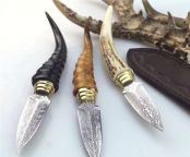 潇-手工羊角茶刀 全长:19cm 茶刃长:5.5cm 钢材厚度:2.7mm 硬度:59HRC 茶刃钢材:锻打大马士革无芯钢、花纹整体突出 手柄材料:黄铜头+(天然羊角)(黄羊角)(鹿角)、配手工牛皮茶套、 礼品盒包装、收藏级! 原生态材料手柄、精挑上等好料子制作、做工细致每一把都是精品.