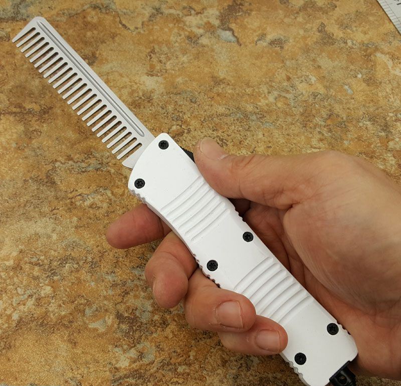 微技术经典直跳伤齿龙黑白梳子跳刀 全长:24CM 刃长:9.6CM 柄长:14.6CM 刃材料:440 刃型:梳子 刃表面:缎光面,CNC磨 柄材料:合金手柄 重量:300g 刀鞘:战术尼龙套