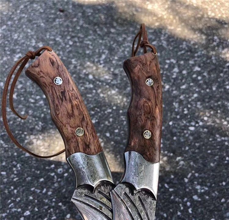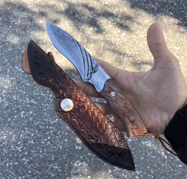 玲珑师寒兵一体大马士革猎刀 全长:22cm 刃长:10cm 刃厚度:4MM 手把长:11.5cm 刃材:大马士革一体钢(78层)风云纹理 柄材:大马士革钢头+巴花榴木 配高端手工雕花牛皮刀套,高级礼品盒装