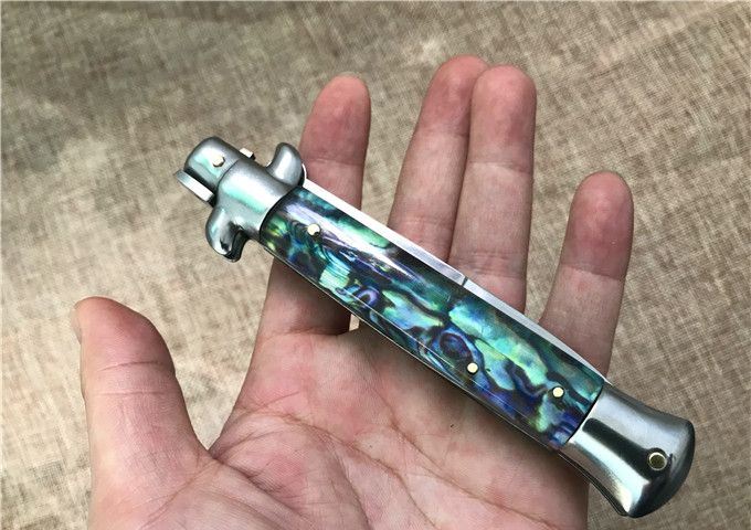 9寸AKC意大利鲍贝跳刀枪刺刃 全长:22.9mm 刃长:10.2mm 柄长:13cm 刃宽:1.2cm(最宽处) 刃厚:3.0mm 刃材:440 硬度:58HRC 刀柄:鲍贝 开刀方式:弹簧 重量:135克 包装:纸盒