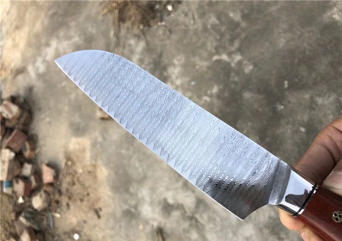 尚品8寸大马士革厨刀 全长:30cm 刃长:16.3cm 手柄长:13cm 刃钢材:大马士革钢 硬度:60HRC 刃厚度:2.2mm 手柄材料:天然科檀木+不锈钢头 包装:高级AV礼品盒 尚品8寸大马士革厨刀,刀刃采用进口VG10大马士革钢(魔音纹理),经二次开刃,才能达到如此锋利、凌空削纸、超薄切片西红柿