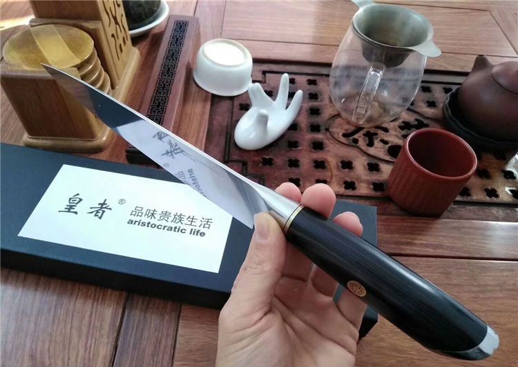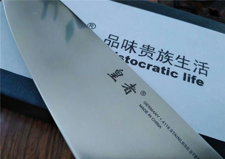 皇者战国雄风高品质厨刀 全 长:330mm 刃 长:200mm 刃 厚:2mm 刃 材:德国进口1.4116钢材 柄 材:不绣钢头+彩木+梅花铜柳钉 硬 度:58-60HRC 其 他:配礼品盒