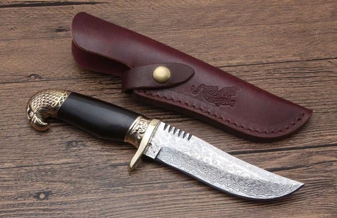新版雄鹰大马士革猎刀 全长:24cm 刃长:12.8cm 刃宽:3.2cm 刃厚:0.28cm 柄长:11.5cm 刀重:325g 硬度高达:60hrc 柄才采用优质黑檀配头层皮套 配送磨刀石羊皮刀布刀油