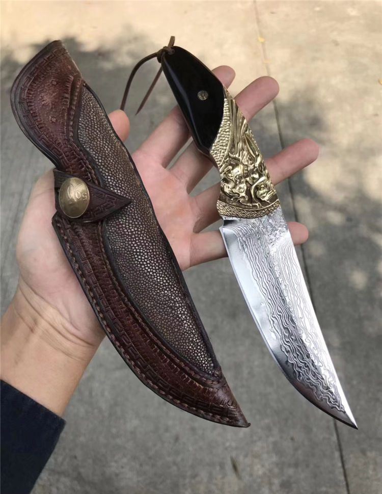 一体龙骨大马士革刀,亮点在于挡手地方采用纯黄铜手工精雕而成,立体感凹凸感很强!搭配进口黑檀木配花钉固定,刃材采用日本夹层大马士革钢VG10钢芯一体龙骨结构制作,锋利度超好!搭配进口纯手工植鞣皮镶嵌魔鬼鱼皮,每一针一线都是纯手工缝制!