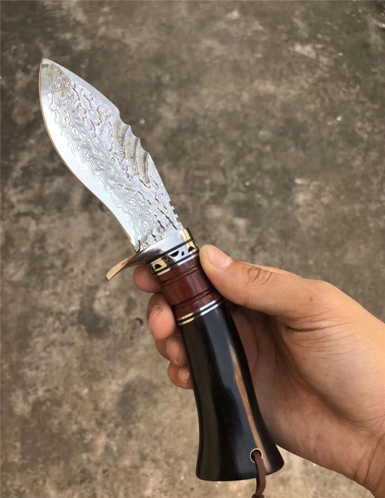 大马士革钢北海战鲨直刀 全长:23cm 刃长:10.5cm 柄长:12.5cm 刃材:大马士革钢VG10 硬度:60HRC(热处理) 刃厚:4MM 刃最宽处:4CM 柄材:钢头+血檀木+黑檀木 包装配置:手工雕花皮套刀套+礼盒装