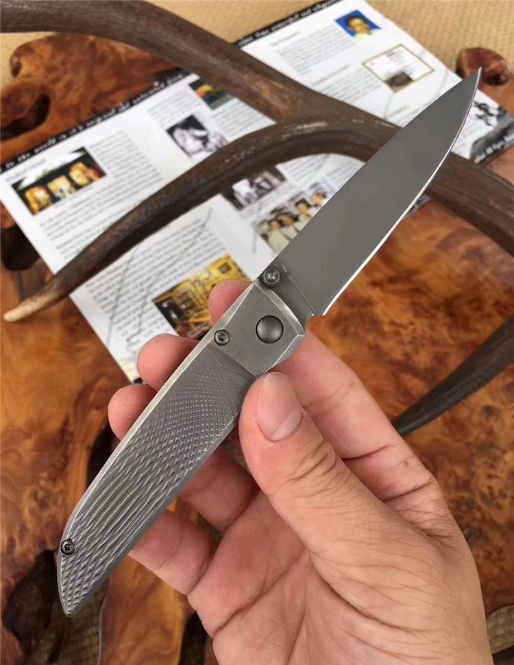 网状折刀 全长:17.5cm 刃长:7.5cm 柄长:9.5cm 刃宽:1.9cm 刃厚:3mm 刃材:9Cr18Mov 重量:85g(净重) 硬度:58HRC 表面:真空钛处理 柄材:CNC电脑锣全钢手柄 锁型:线锁