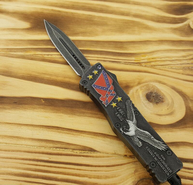 美利国坚联盟军(1861-1865)纪念款式直跳 全长:22.5CM 刃长:9CM 柄长:13.5CM 刃厚:0.3CM 硬度:56HRC 刃材:440 表面:石洗 净重:295克(整刀) 毛重:320克(含包装物) 开合:双动作,直推开关,自动弹出和收回 包装:耐磨专用战术尼龙套 玻璃敲击器:不锈钢玻璃敲击器 战术石洗风格,外贸款式
