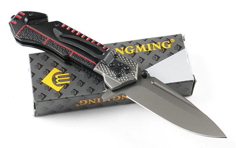 创名快开333折刀 全长:21.0cm 刃长:8.2cm 柄长:12.8cm 刃宽:2.7cm 刃厚:2.8mm 刃材:440 重量:200(含包装) 硬度:57HRC 表面:灰钛, 柄材:钢片+铝片上色彩 锁型:线锁 其他:配厂盒