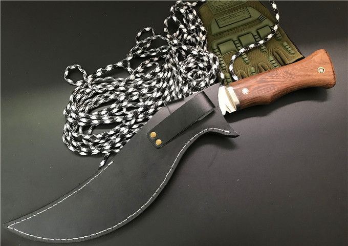 暴风战术狗腿弯刀 全长:44.5CM 刃长:30.5CM 厚度:0.5CM 刃材:7Cr17 硬度:58HRC 重量:约500g 刀面:超镜光面 柄材:鸡翅木 刀鞘:皮套