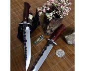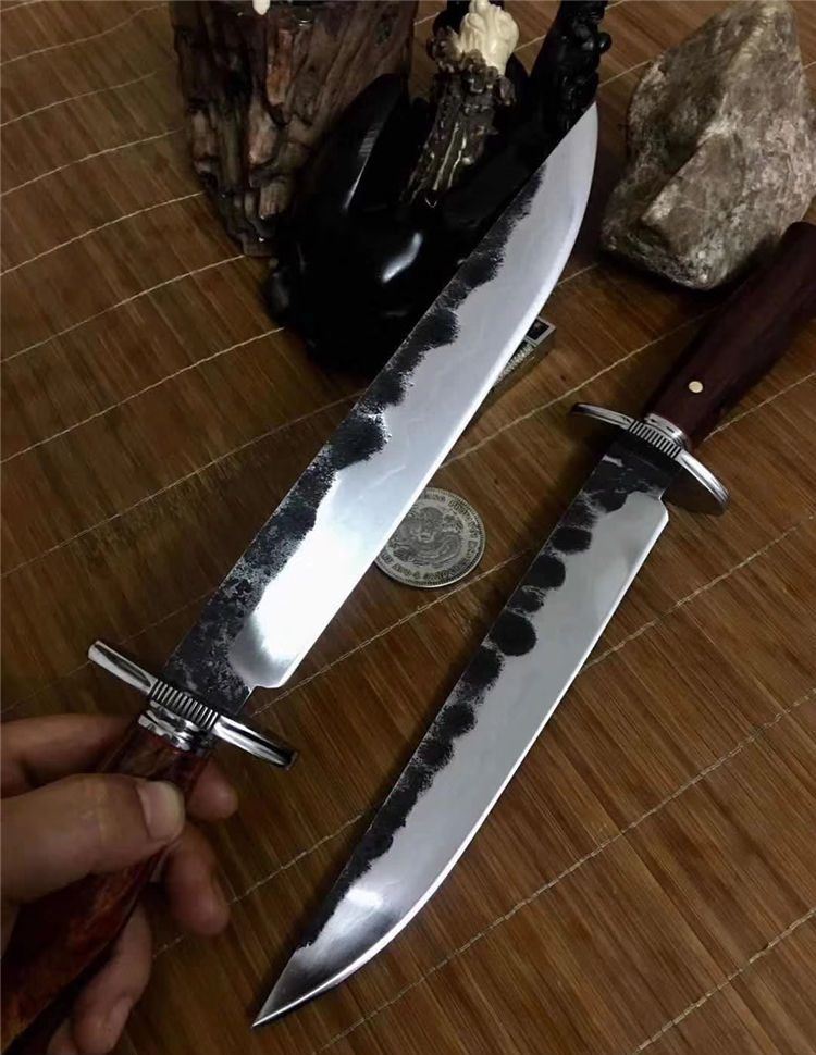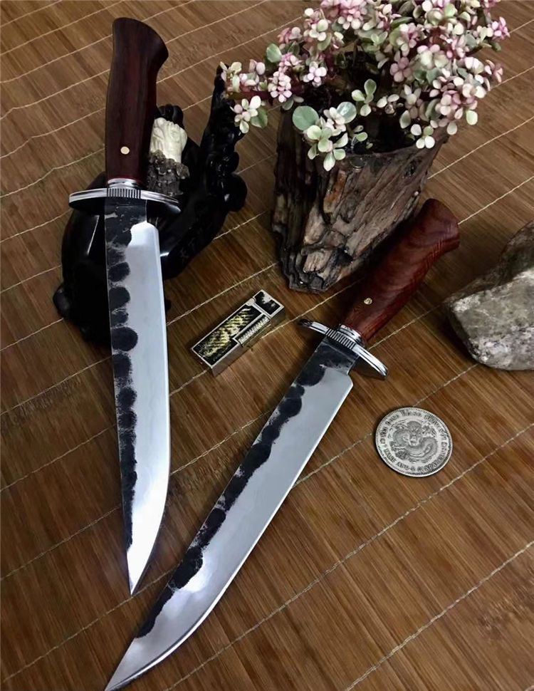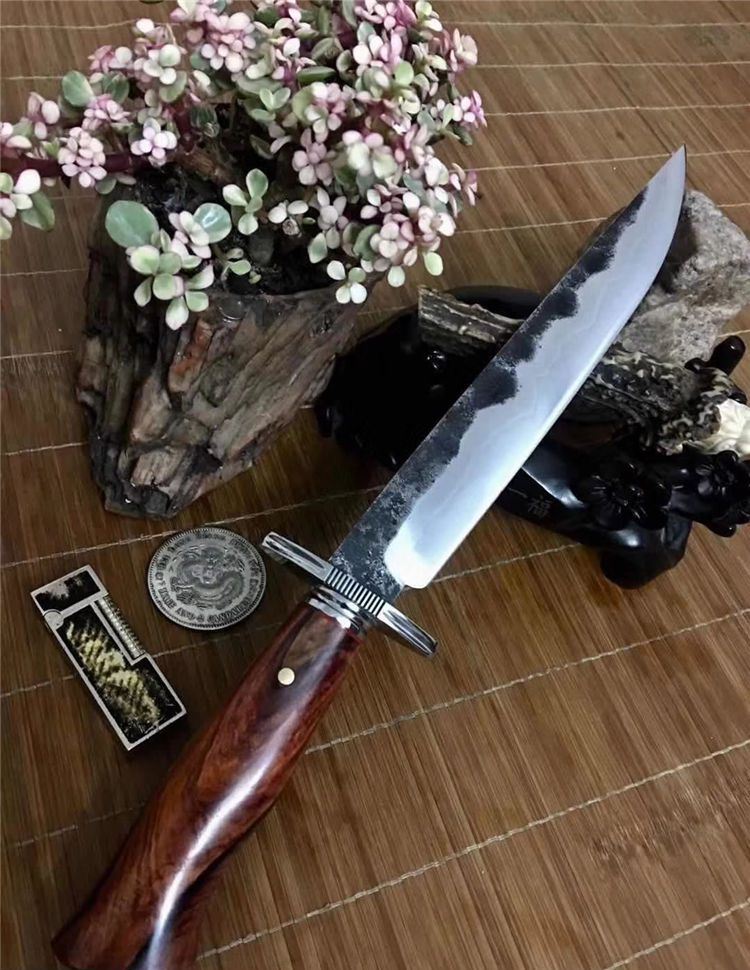 潘大师锻打博弈直刀 总长:38公分 刃长:24公分 厚度:0.5公分 硬度:61 红酸枝木柄 潘先匠人原锻纯手工打造,百分百纯手工制作,多年制刀技术 把控每个细节完工度