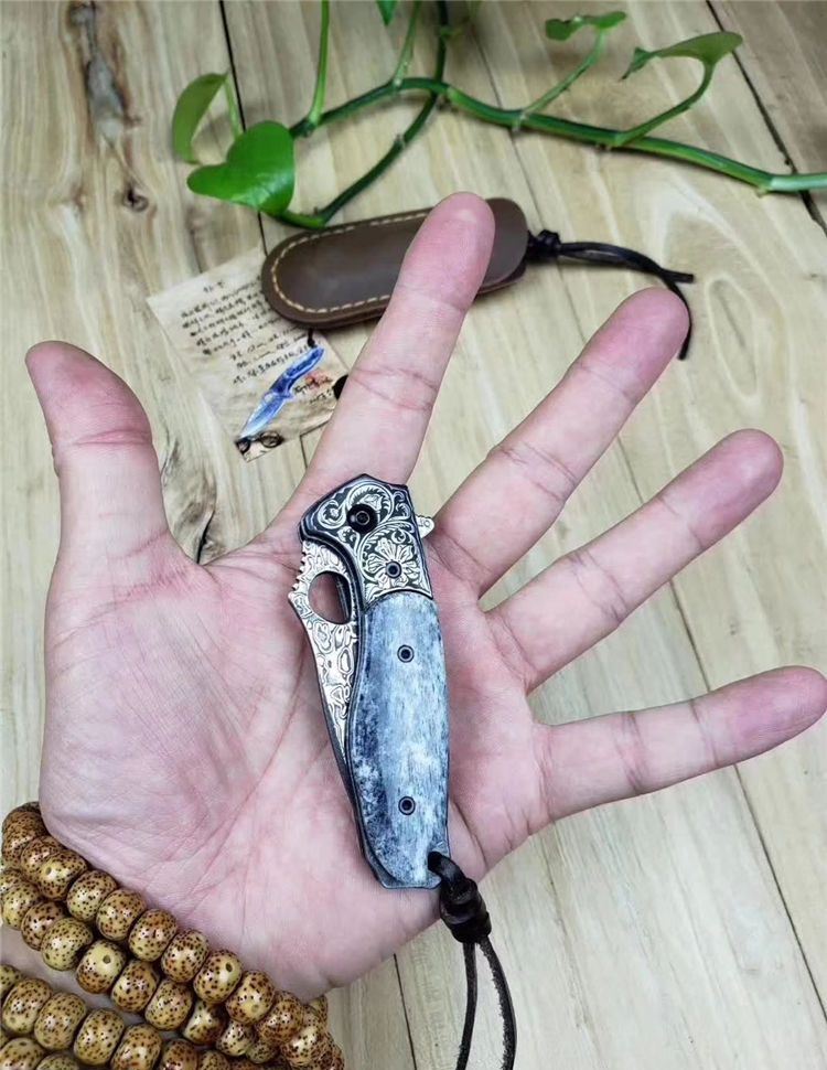 静静的湖面一只黑鳄悄悄的浮出水面,硕大的眼睛注视着前方,慢慢的向猎物靠近..黑鳄折刀选用4mm厚VG10刃钢大马士革锻打祥云纹,经多道打磨刀刃厚度达到3.6mm,刀隔不锈钢刻原创唐草图案,刀柄精选老牛骨精细打磨抛光,黑化做旧工艺,不锈钢底骨手工挫花。轴部镶嵌两片高精度滚珠轴承,一体快开鳍,开合顺滑。配置头层牛皮手工缝制皮套,赠送简师傅收藏证书,此把【黑鳄】折刀做工精细,形象生动,宽厚的刀刃犹如黑鳄鱼的头部,悄悄的从草丛中探出头来,乌黑发亮的身体拖着一条长长的尾巴