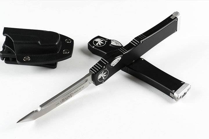 MICROTECH微技术光炫6拉尾伸缩刀 全长:26.8 CM 刃长:11.0 CM 刃宽:2.0CM 刃厚:0.431CM 刀刃材质:9CR18MOV 柄材:铝合金 刀型:直跳 锁定类型:按钮锁。内置保险锁,放在口袋不会误开。 重量:296克(含包装) 附件:Kydex鞘,说明书,彩盒,送拆刀工具 ,分T头和尖头两款,下单请注明。 整刀用CNC,电脑锣,线切割制作而成,手工,精密度非常高,绝对不会缩头,很值得收藏的一把刀,数量有限。