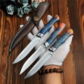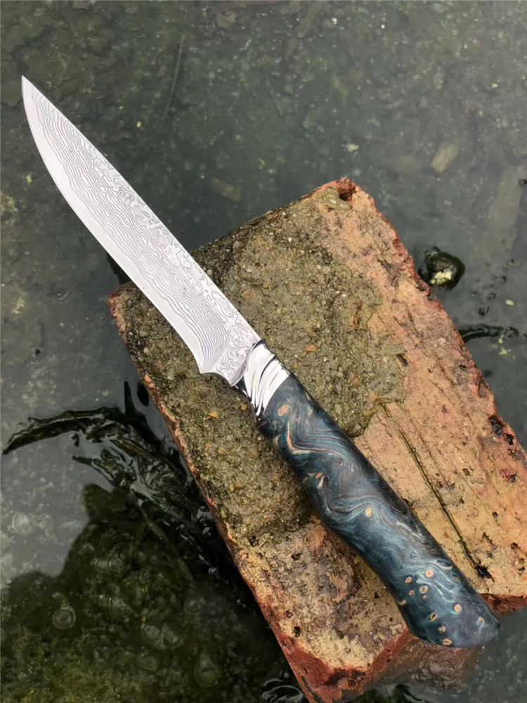 玲珑师作品之一,一款非常强势的猎刀VG10大马士革钢刃材制作,超级耐磨耐腐蚀,钢材韧性与防锈性保持度非常好,手柄/(稳定固化木材)青色火焰,瑰丽绚烂,充满了神秘的浪漫色彩
